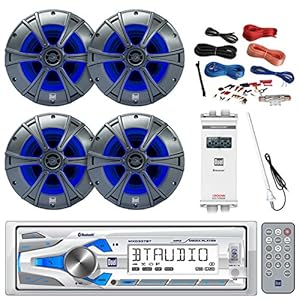 Boat Package: Dual Single DIN Marine In-Dash Receiver w/Bluetooth, Dual 8″ 2-Way Marine Speaker, 1200-Watt 4 Channel Amp, 10″ Subwoofer w/ LED, 5-Channel Amp, 8-G Amp Install Kit, Antenna
