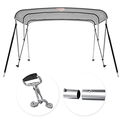 Kingbird Bimini Boat Top made of 600D/230GSM Marine Grade polyester canvas, PU coated, 100{4f68e189d3cf4e3ebdda5133e35265d735149066fae22641530f59a80cc6d0de} waterproof, breathable, Anti-UV and Anti-fade.Double stitched seams, neat sturdy and durable stitching. 1 INCH Stainless Aluminum with stainless steel hooks, buckles & saddles, protects from strong winds. The 2 rear support poles and 2 straps design, easy to set up,fold and space saving. Unlike others’, our Bimini top with boot stitched on the canvas, protects from blowing off.