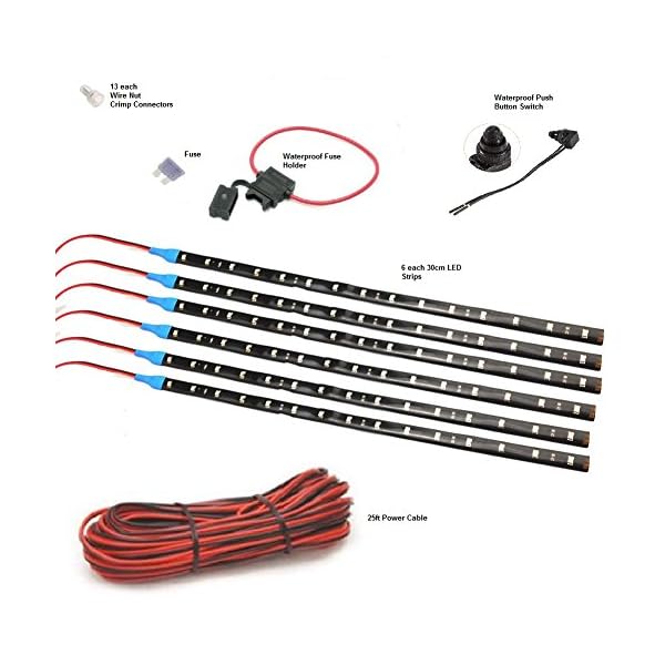 GBO Pimp my Boat Kit includes all the materials you will need to make your boat standout from the others! Includes: 6pcs 12 inch Green LED Strips. 1pc 12 inch Red LED Strip (Bow Navigation). 1pc 12 inch Green LED Strip (Bow Navigation). 30ft 22 gauge Wire. Waterproof Push button Switch. Wire Crimp Connectors. Fuse and fuse holder.