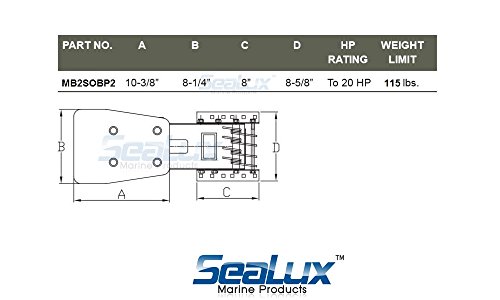 5 position locking height adjustment Wide track body for added stability. Made of tough 304 Stainless Steel Mounting pad: 8-1/4″ wide * 10-3/8″ long ×2″ thick; Designed to also accommodate the width dimensions of late model auxiliary outboard motors Maximum HP Capacity: 7 to 20. Maximum Motor Weight: up to 115 lbs. Vertical Travel: 11.25. Motor Pad (w x h x d): 8-1/4″W *10-3/8″H ×2″ D; Installation Space Required (w x h): 9 x 9.