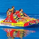 The one-of-a-kind BANDWAGON features a dragless nose design for effortless towing that eliminates nose diving at startup. The innovative seating arrangement allows you to sit forward, backward, kneeling, or lying down for the style of ride you’re craving. The BANDWAGONs feature state-of-the-art high-back recumbent mesh seating, EVA foam floor pads, and foam seat bumpers to keep you in place. The heavy-duty full nylon cover is equipped with a multitude of double webbing foam handles with knuckle guards. Speed Safety Valves make inflation and deflation as simple as possible. The patented aluminum Quick Connect tow system will get you on the water fast! 1-4 rider, 120 in. x 73 in. (deflated) 118 in. x 70 in. (inflated)