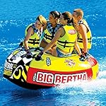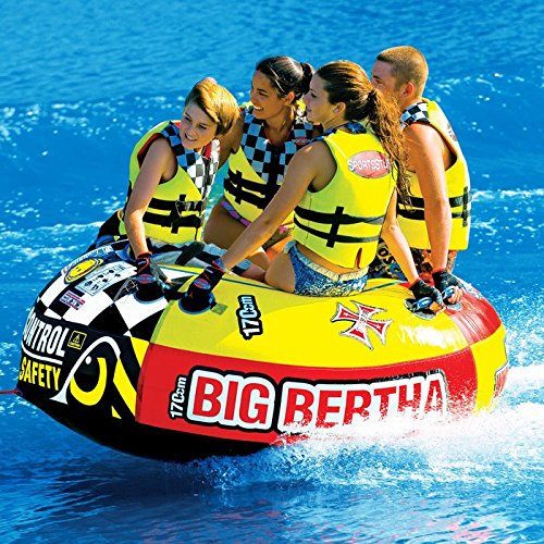 Get ready for big fun with the Big Bertha towable. This four-person classic-action towable is updated with a host of state-of-the-art features, such as an air-cushioned floor, nonslip cushioned handles with padded knuckle guards, and a fast and easy Quick Connect tow system. Just slip your towrope over the Quick Connect and you’re off and tubing. Just as importantly, the Big Bertha is built heavy duty, with a tough partial nylon cover and a heavy-gauge PVC bladder. And with the ability to support up to 680 pounds, you can ride with two or three of your friends, or you can try tackling the Big Bertha by yourself. Other features include reflective safety piping and a speed safety valve.